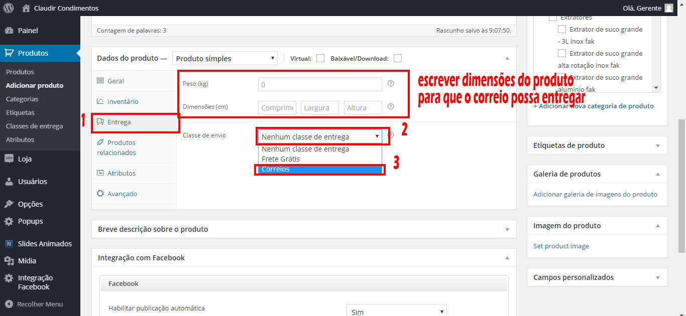 ❺ Selecione agora a aba Entrega e preencha as informações como Peso, Dimensões e selecione a forma de entrega que será realizada (Correio).