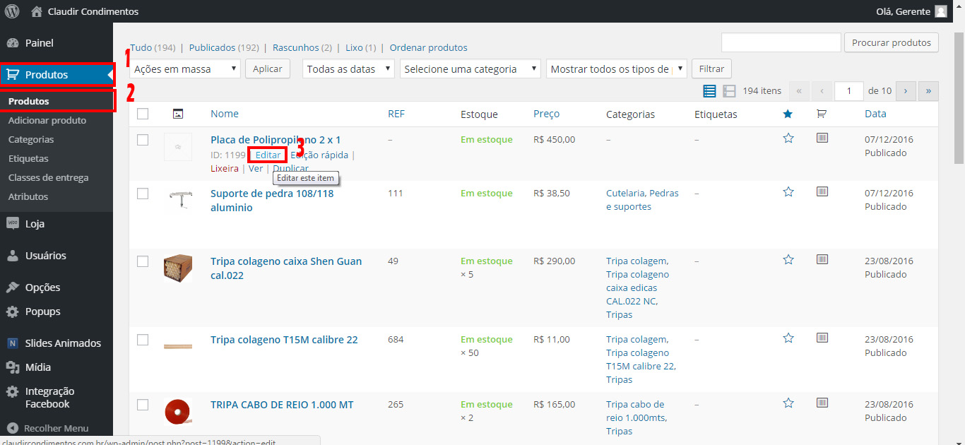Localize no menu do lado esquerdo da sua tela a opção PRODUTOS, ❸ Localize o produto que deseja editar na lista, e ao localiza-lo, corra o ponteiro do mouse por cima e irá aparecer a opção de EDITAR e clique sobre ele.