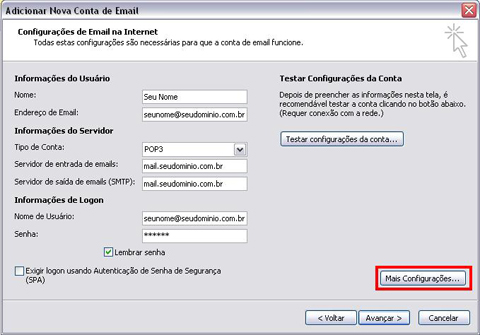 Servidor de Saída (SMTP) digite mail.nae.com.br.